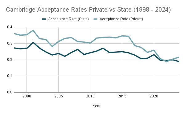 As for acceptance rates, there has been a large divide between the two school types for most of the years recorded, though Cambridge is now closing this gap somewhat. Was this due to the state school targets they implemented back in 2020? And what will this graph look like now that these targets have been removed?
