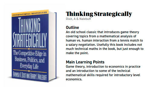 - Dixit, A.K. and Nalebuff, B.J. (1993), Thinking strategically: The competitive edge in business, politics, and everyday life, W.W. Norton.