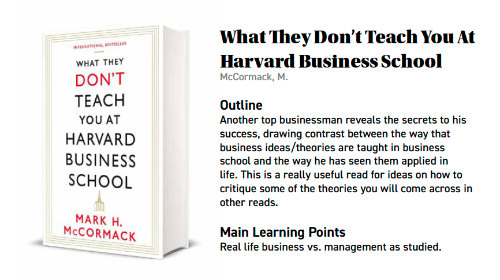 - McCormack, M.W. (1984), What they don’t teach you at Harvard Business School: Notes from a street-smart executive. New York: Bantam.