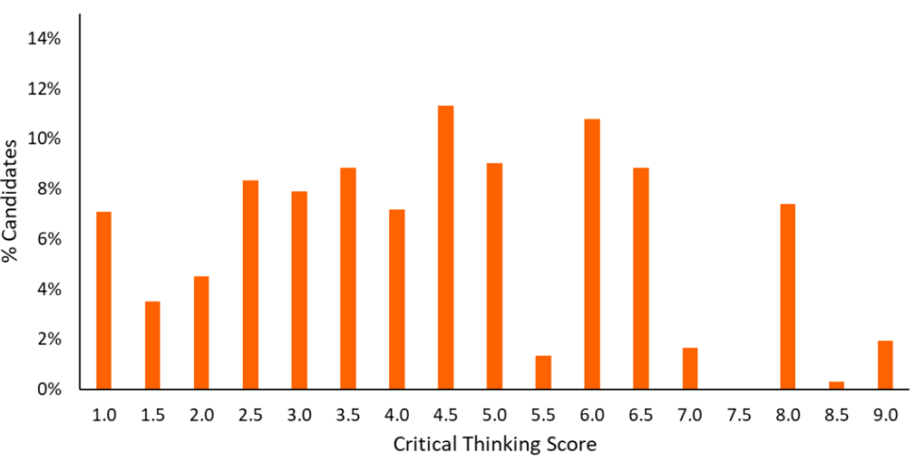 Critical thinking is a little bit of a different picture. Most common was 4.5 with just under 12% achieving it. But no one scored 7.5, which seems a little out of the ordinary for these kinds of subtests. Additionally, about 7% of applicants scoring 1.0, which is a much higher percentage than the Problem Solving section.