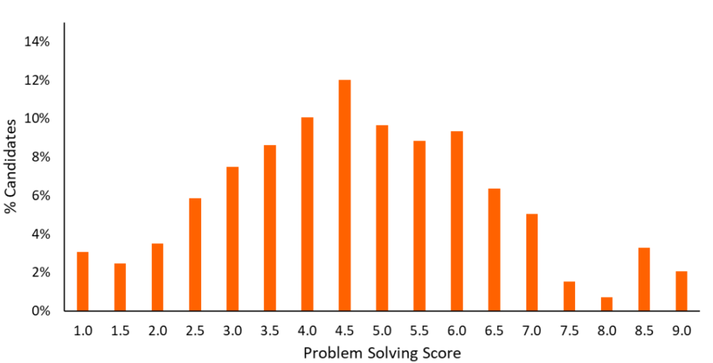 We’ll start with problem solving as this one is a bit more of a normal scoring board. It’s a fairly standard curve with the most common score being 4.0 and the least common being 8.0.